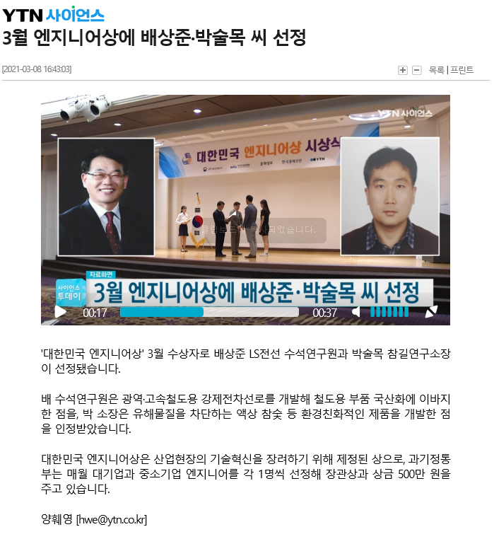 "대한민국 엔지니어상" 2021년3월 수상 선정 보도자료 (ytn사이언스 영상 보도자료) 페이지 정보 작성자 최고관리자 작성일21-03-10 13:50 조회32,311회 댓글0건 관련링크 본문 ■ ytn사이언스 영상 보도자료 ■ 댓글목록 등록된 댓글이 없습니다. 이전글 다음글 목록